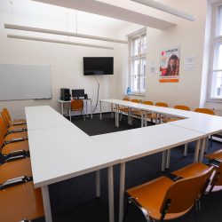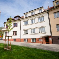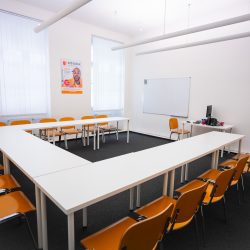 Učebny se nachází v 2. patře historické budovy, která bezprostředně sousedí s náměstím Míru.